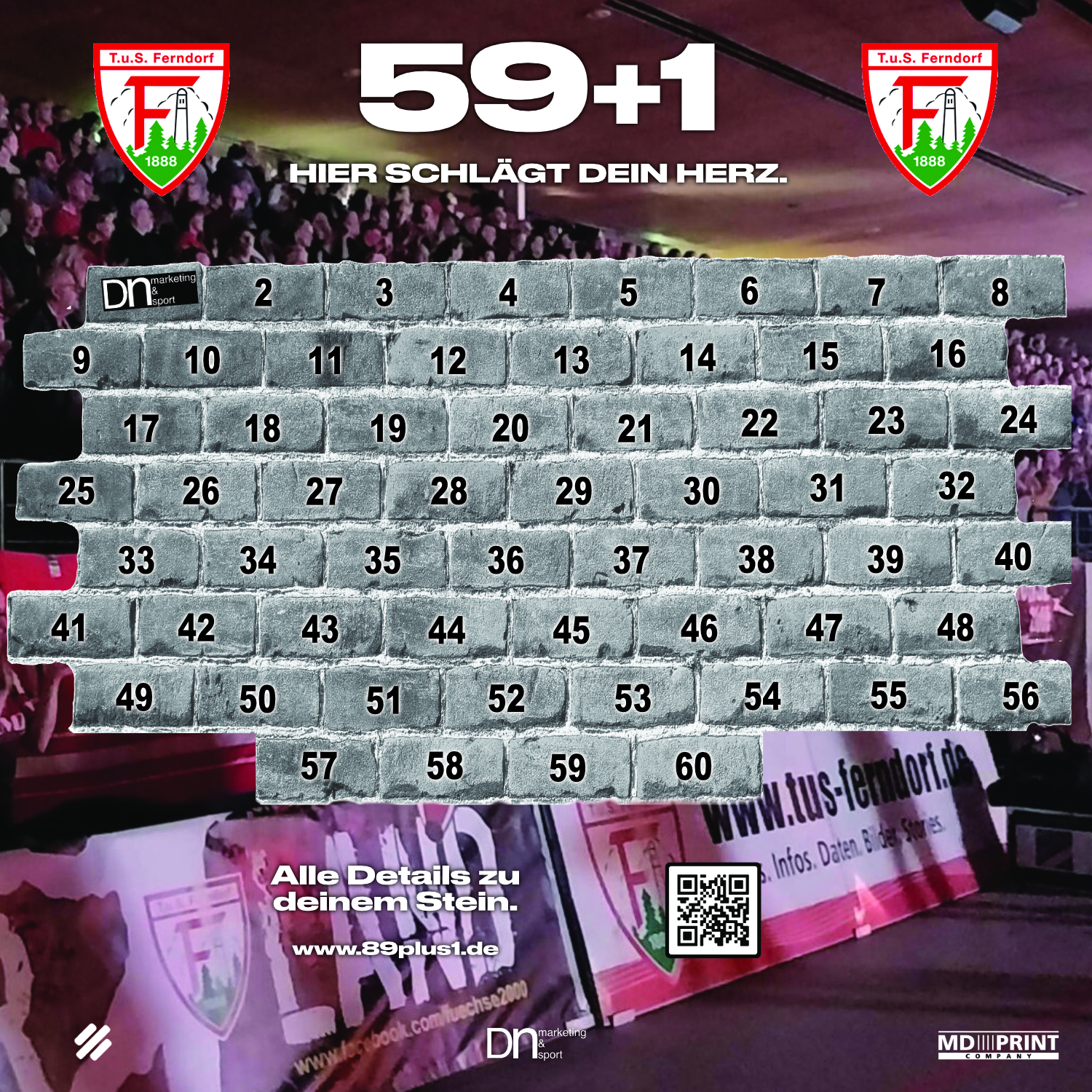 Dein Name oder Unternehmenslogo erscheint auf unseren offiziellen Social-Media-Kanälen – DU präsentierst das Tor. Außerdem wirst Du dauerhaft auf unserer Sponsorenwand 59+1 sichtbar sein.